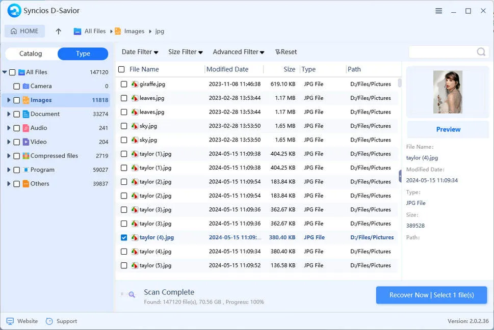 Syncios D-Savior excels in data recovery, supporting over 1,000 file formats for efficient file recovery. This versatile recovery software handles all types of data loss, from recovering deleted files to restoring rare image formats and specialized document types. With its robust capabilities, Syncios D-Savior significantly increases your chances of a full data recovery.