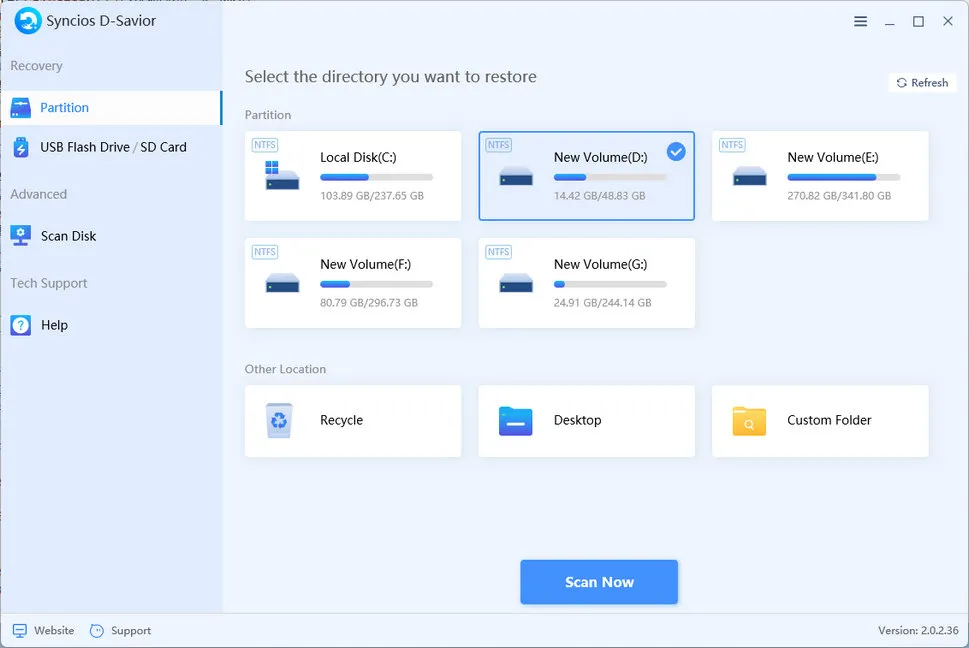 Syncios D-Savior is a powerful data recovery software designed to recover deleted files and restore data from formatted devices. Whether you need to recover photos, videos, or other types of files, this versatile recovery software supports a wide variety of external devices and storage media, ensuring reliable file recovery for all your needs.