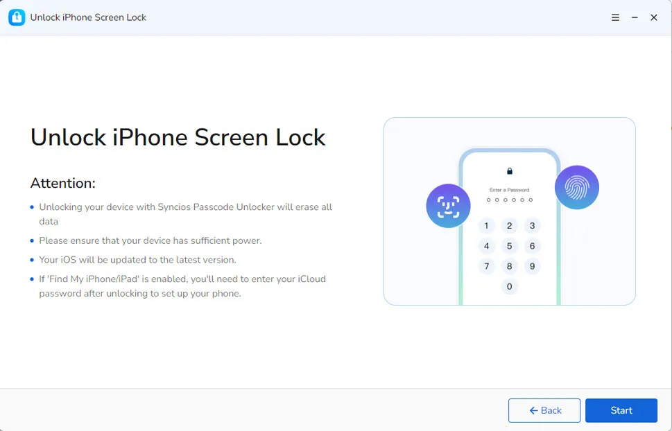 If you're locked out of your iPhone due to a forgotten screen passcode, Face ID, or Touch ID, Syncios Passcode Unlocker is the solution. Unlock any iPhone screen lock, including 4/6-digit passcodes, Face ID, and Touch ID, with just one click. It works in all scenarios and supports all iPhone models, from the iPhone 6 to the latest iPhone 15, iPhone 16, iPhone 17, and beyond.